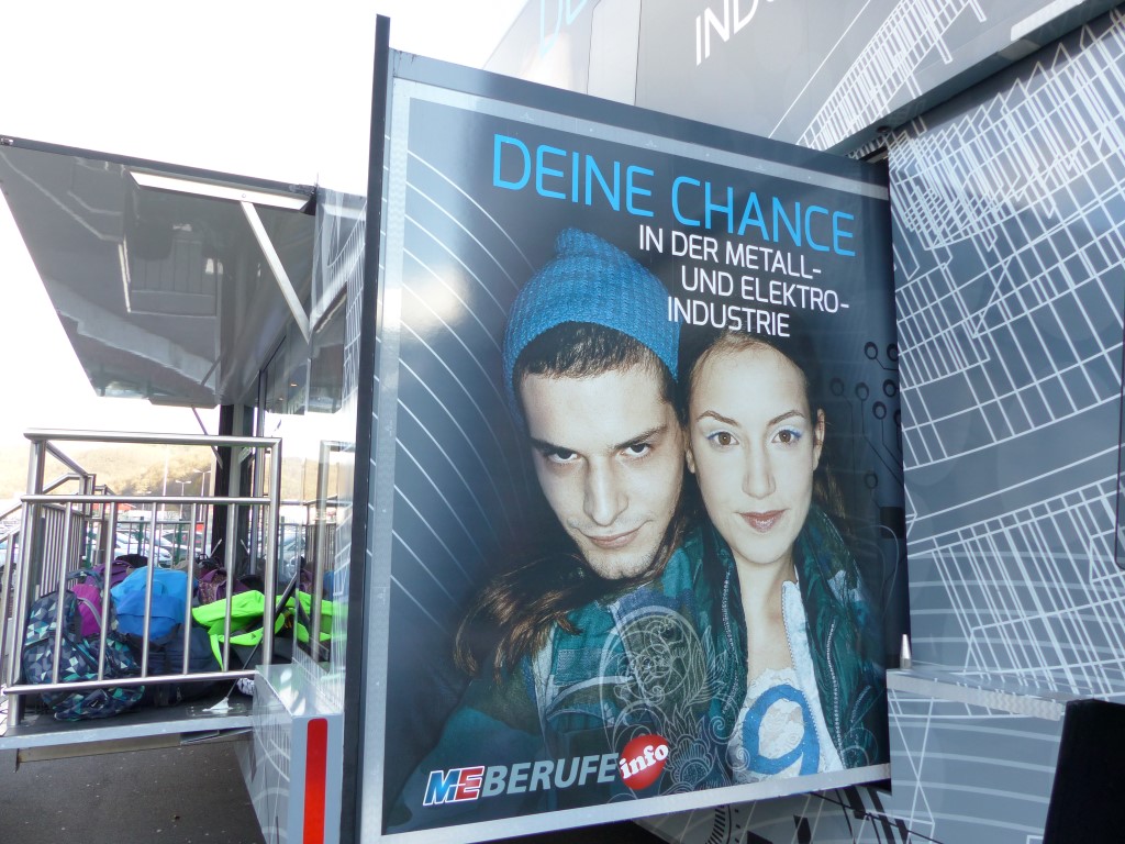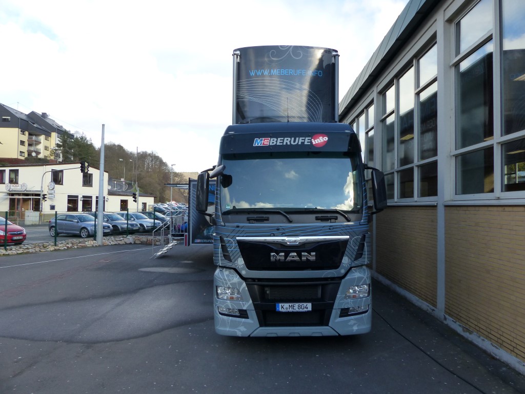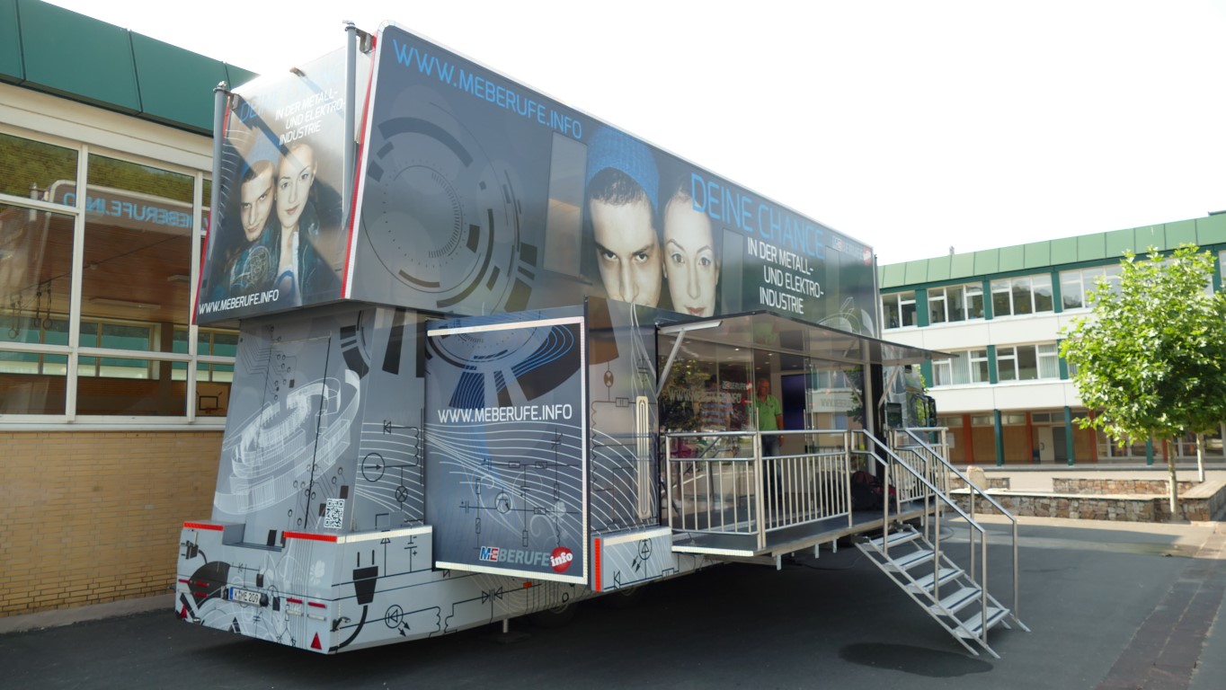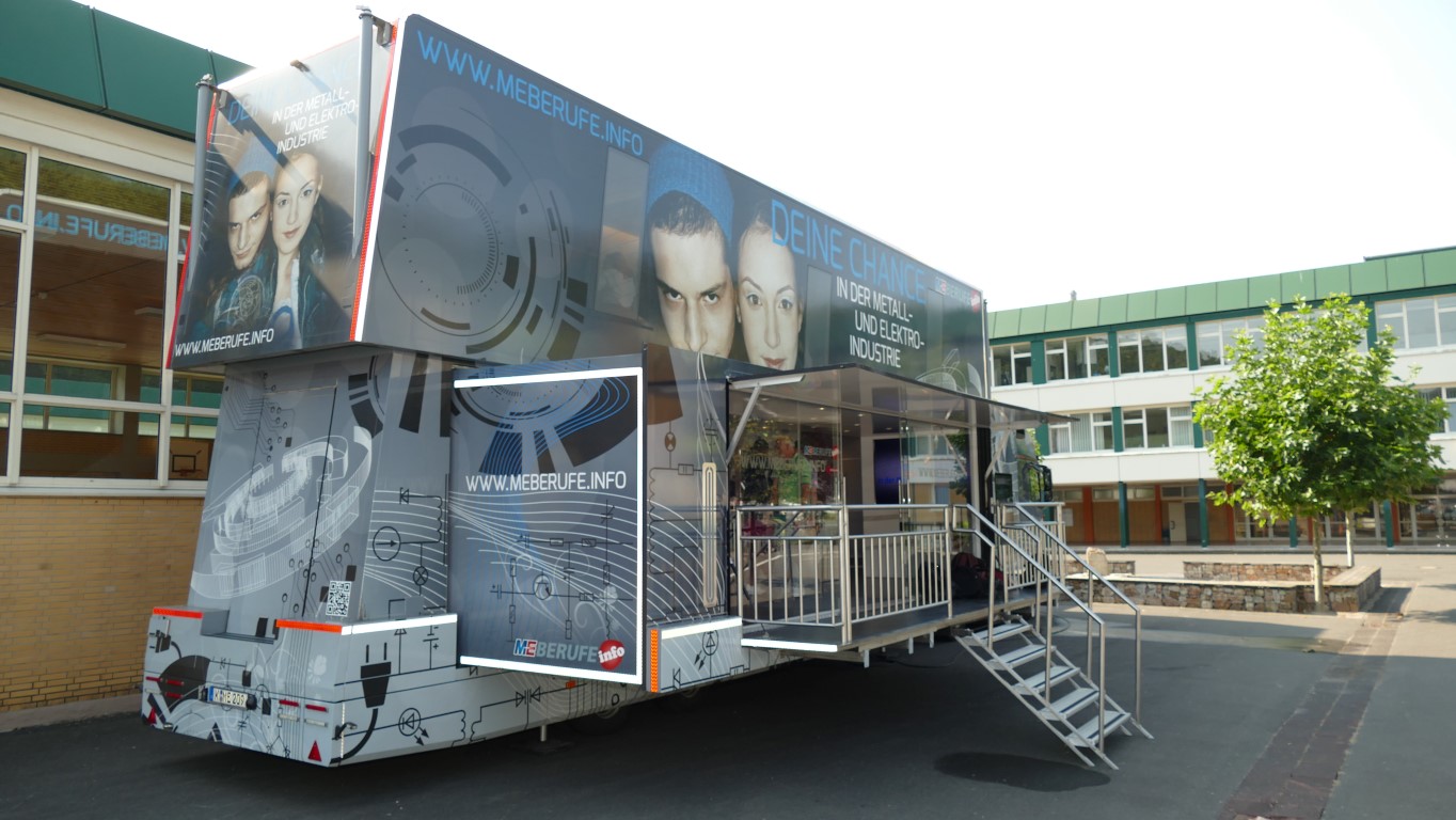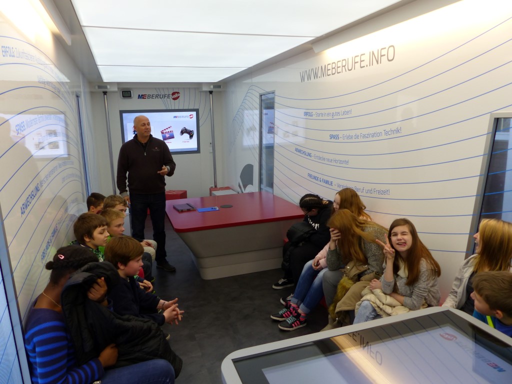 In Kooperation mit der Berufsberatung bot auch dies eine weitere Möglichkeit, freie Ausbildungsplätze in der Region, speziell im Kreis Birkenfeld, zu finden. Professionell begleitet wurden die Jugendlichen durch die Mitarbeiter der EWI-Medien GmbH und durch den Arbeitgeberverband Gesamtmetall. Auch im persönlichen Dialog konnten unsere Schülerinnen und Schüler besondere Themen mit den Mitarbeitern vertiefen. Begeistert waren die Jugendlichen vor allem von der hochwertigen Technik dieses mobilen Berufsinformationszentrums und von der „coolen“ IT-Technik.