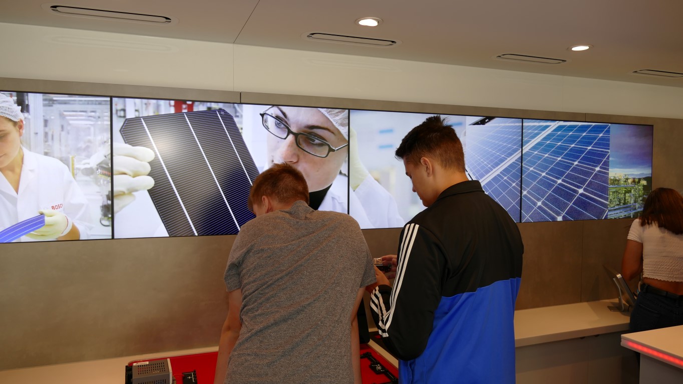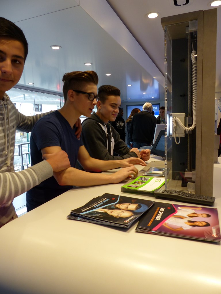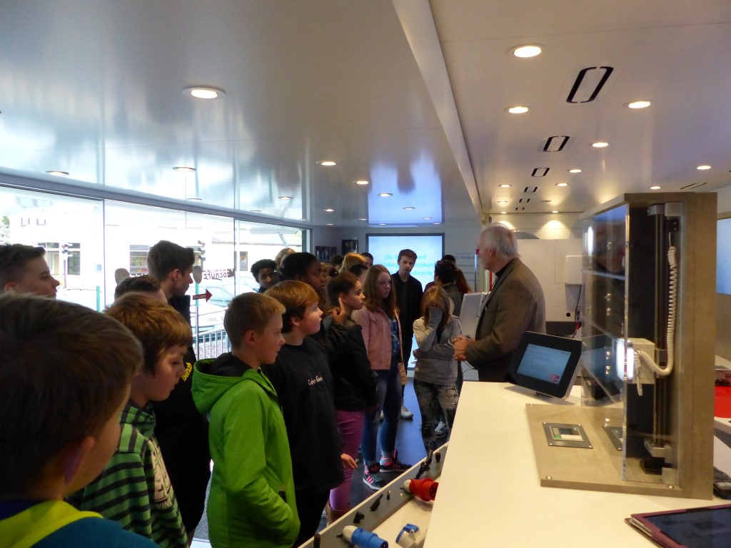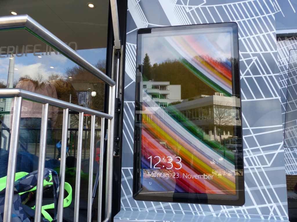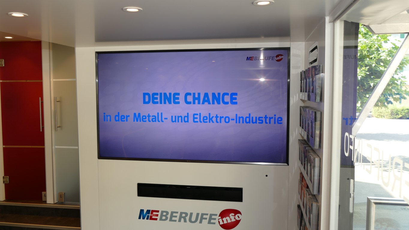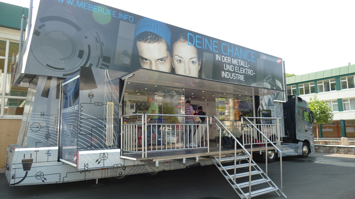 In Kooperation mit der Berufsberatung bot auch dies eine weitere Möglichkeit, freie Ausbildungsplätze in der Region, speziell im Kreis Birkenfeld, zu finden. Professionell begleitet wurden die Jugendlichen durch die Mitarbeiter der EWI-Medien GmbH und durch den Arbeitgeberverband Gesamtmetall. Auch im persönlichen Dialog konnten unsere Schülerinnen und Schüler besondere Themen mit den Mitarbeitern vertiefen. Begeistert waren die Jugendlichen vor allem von der hochwertigen Technik dieses mobilen Berufsinformationszentrums und von der „coolen“ IT-Technik.