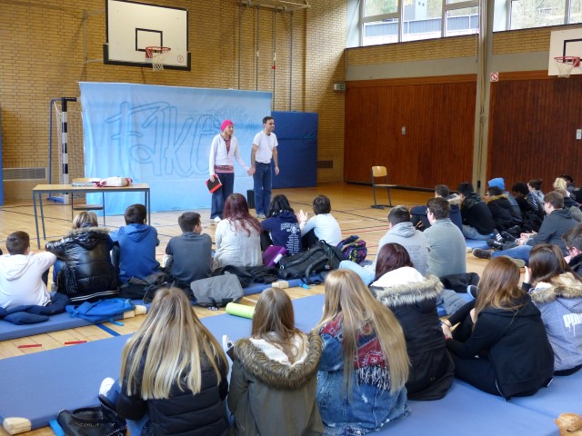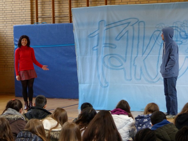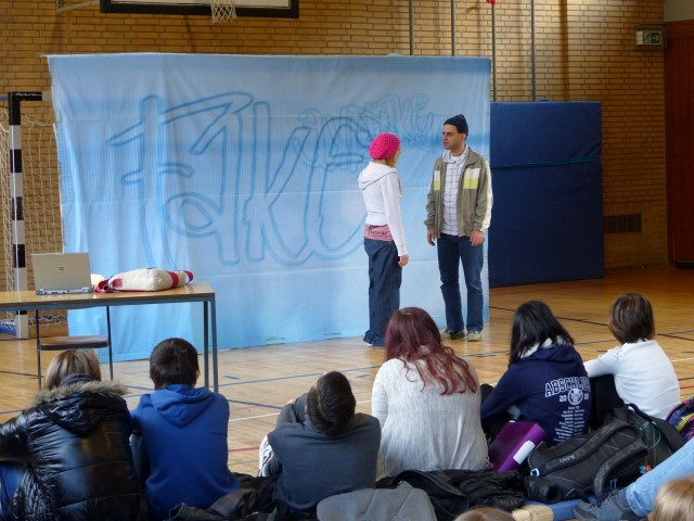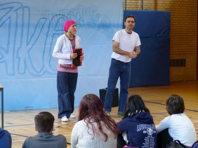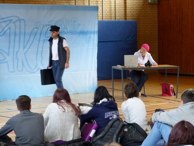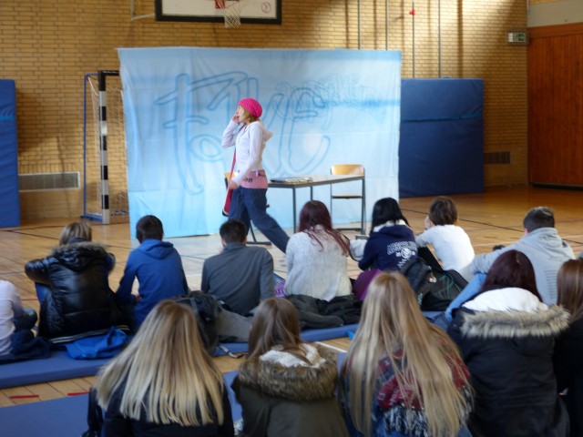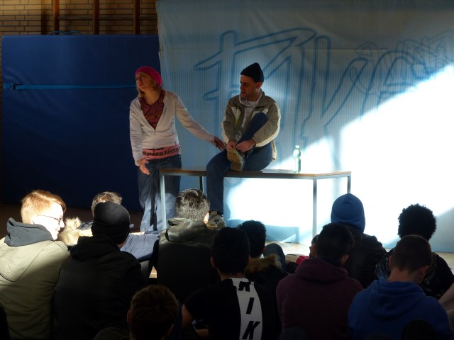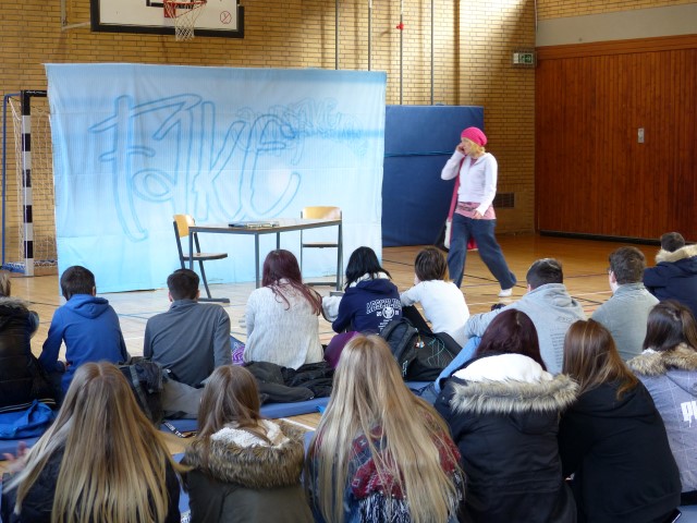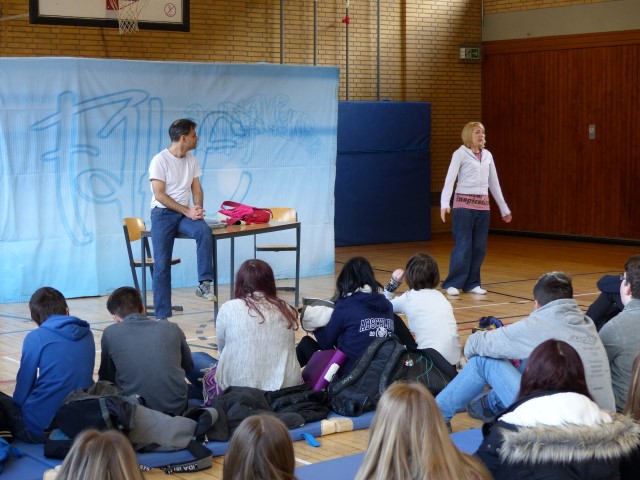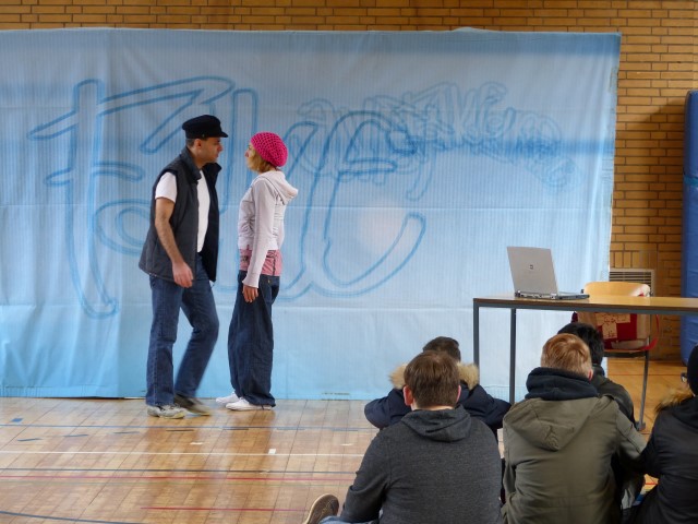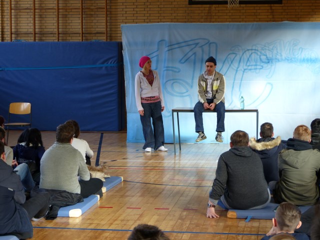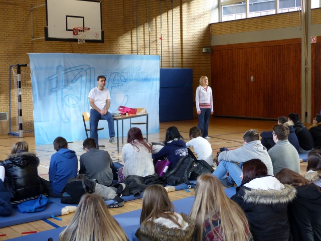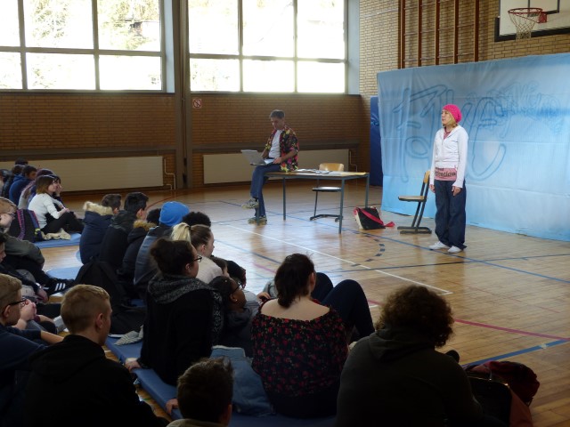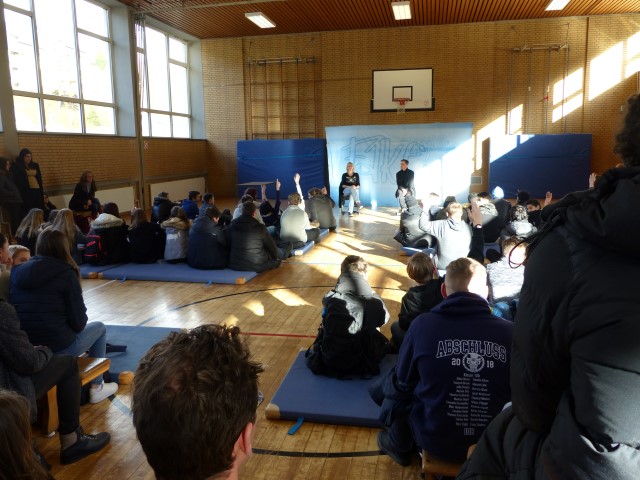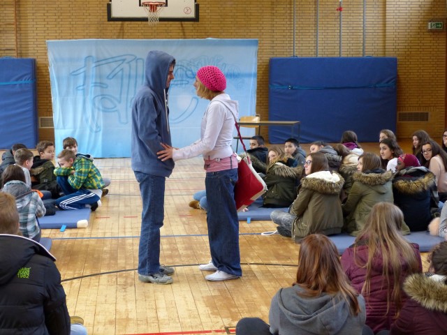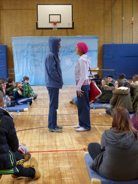 Wie aus vermeintlichem Spaß sehr schnell Ernst werden kann, zeigten am Donnerstag, den 18.01.2018 die beiden Schauspieler Romana Schneider und Alexander Abramyan des „Ensemble Radiks“ aus Berlin bei ihrer fesselnden Vorstellung in der Turnhalle der Ida-Purper-Schule.