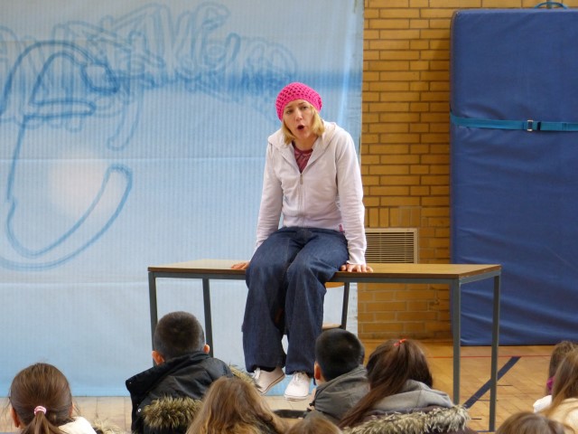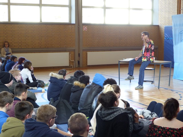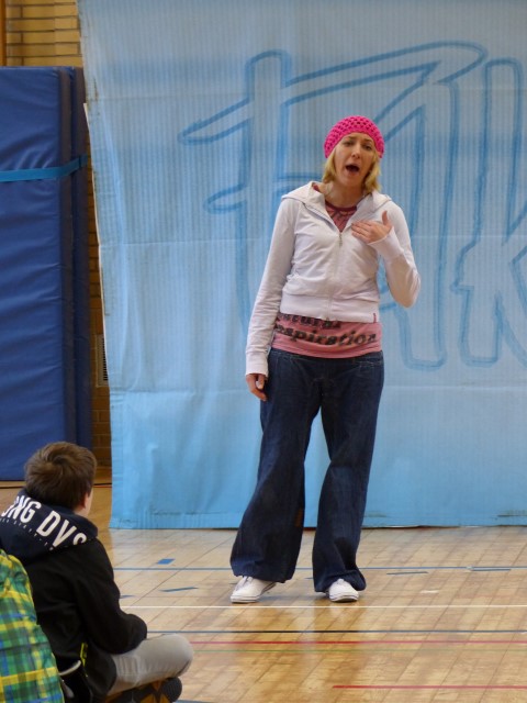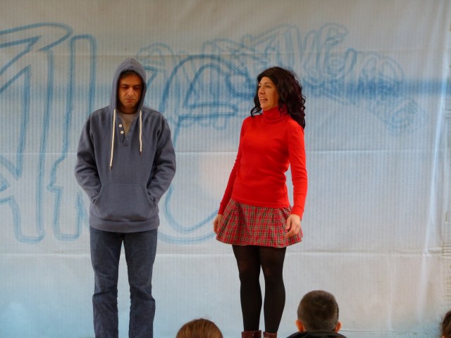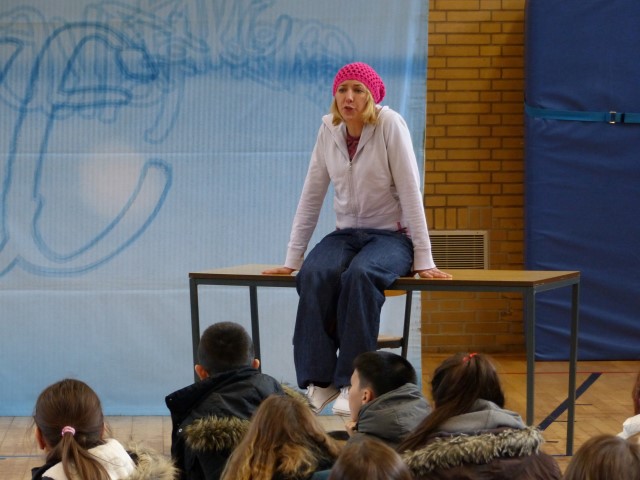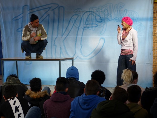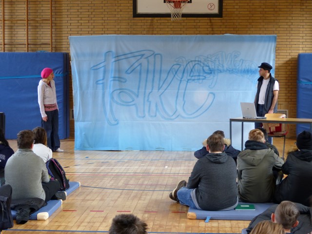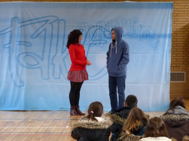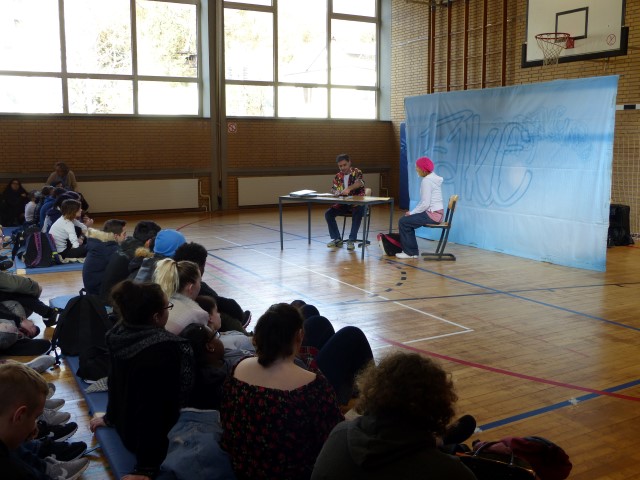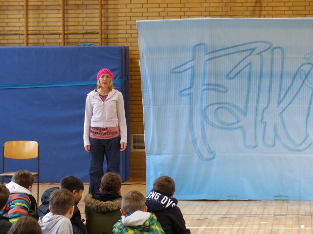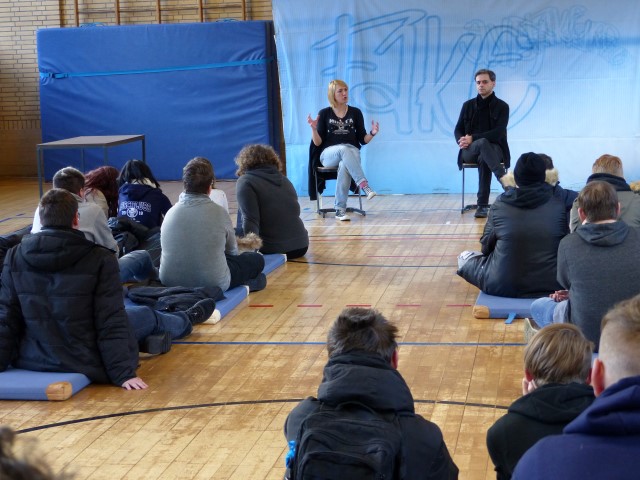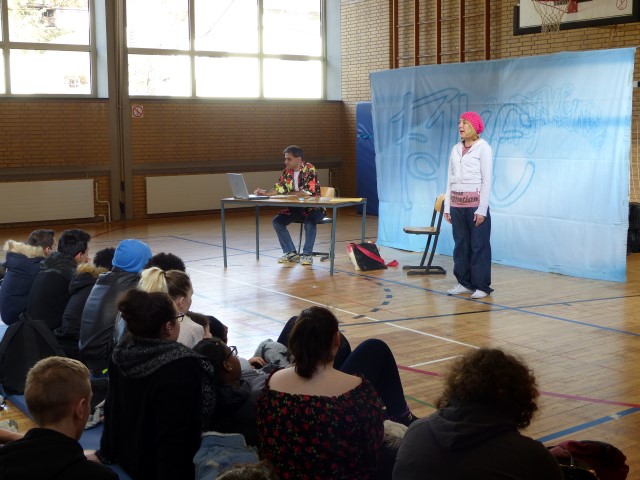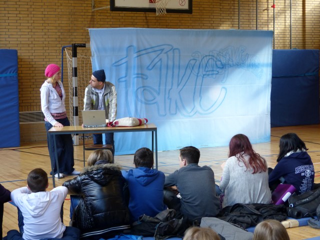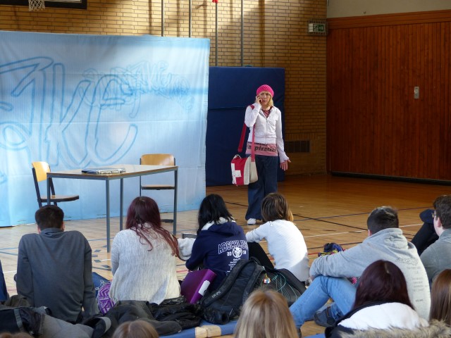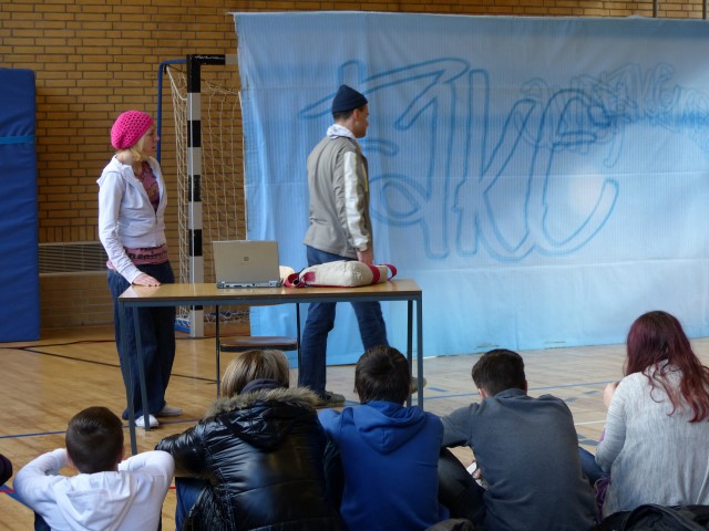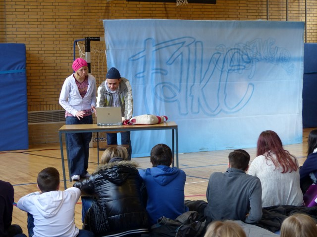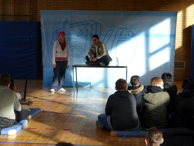 Wie aus vermeintlichem Spaß sehr schnell Ernst werden kann, zeigten am Donnerstag, den 18.01.2018 die beiden Schauspieler Romana Schneider und Alexander Abramyan des „Ensemble Radiks“ aus Berlin bei ihrer fesselnden Vorstellung in der Turnhalle der Ida-Purper-Schule.