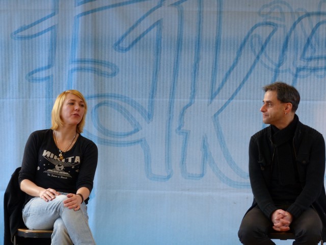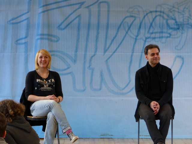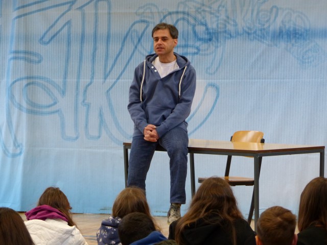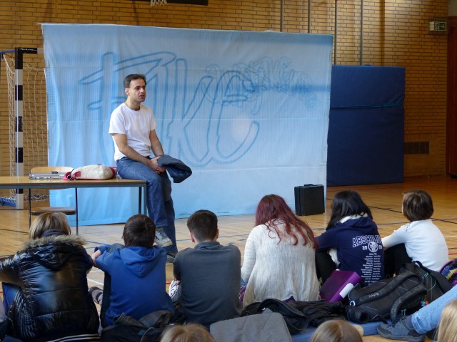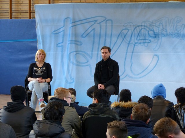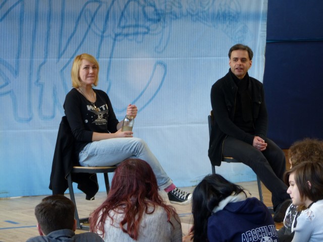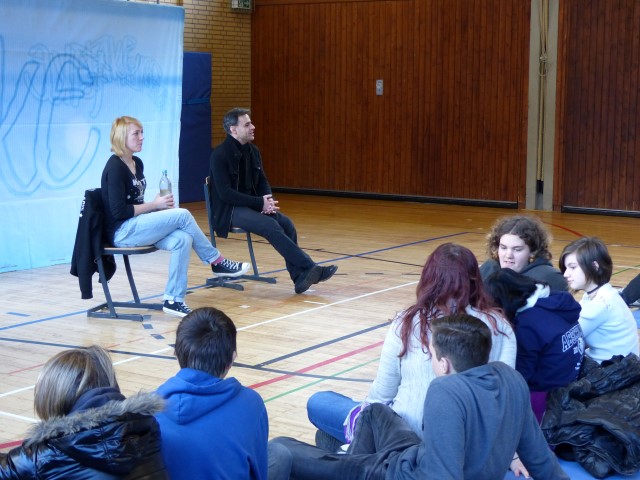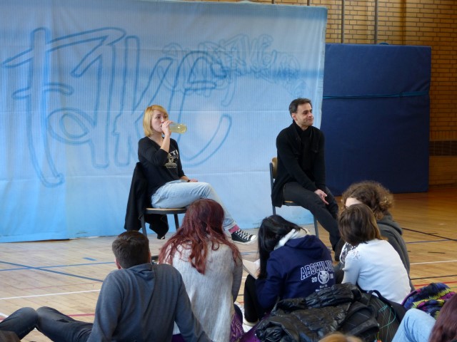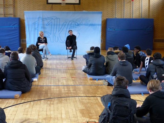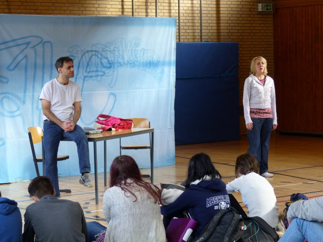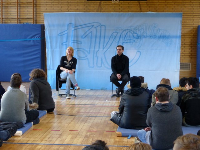 Fragen zur dargestellten Geschichte oder zu Produktion bzw. Hintergrundinformationen des Tourneetheaters „Ensemble Radiks“ wurden im anschließenden Gespräch zwischen Schülern und Schauspielern besprochen.