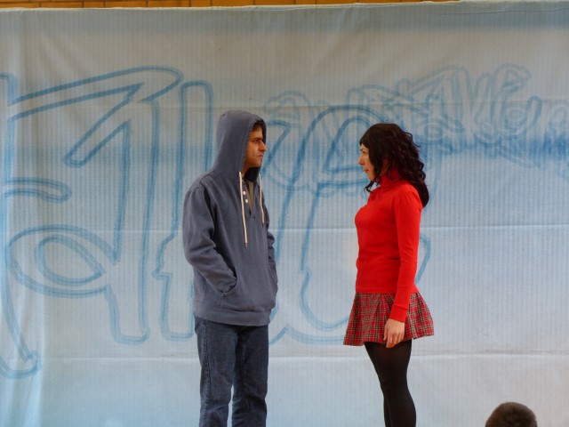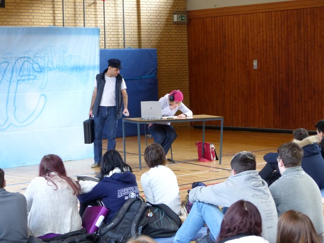 In einem jugendgerechten und aktuellen Stück, das die beiden Akteure in verschiedenen Rollen überzeugend, authentisch, aber ohne „moralischen Zeigefinger“ den Schülern der Klassenstufen 7-10 darboten, wurde dargestellt, wie Cybermobbing entstehen kann.