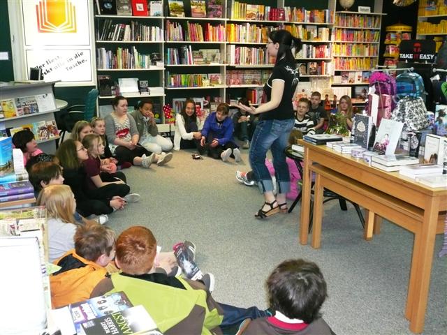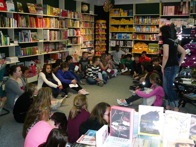 Die Fünftklässler wurden von Frau Wegmann, einer Mitarbeiterin der Buchhandlung, empfangen und über die Entstehung dieses Tages und seine Besonderheiten informiert, konnten aber auch selbst ihr Wissen über Bücher und das Lesen einbringen, was allen sichtlich Spaß bereitete.