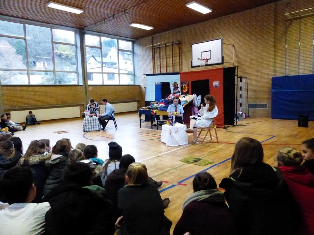 Die Gruppe britischer Schauspieler führte für die Klassen 5, 6 und 7 das Stück The Slug in the Shoe auf. In leicht verständlicher englischer Sprache wurde ein Thema präsentiert, das Kinder und Jugendliche anspricht und bewegt. Es geht um alleinerziehende Eltern, die sich ineinander verlieben, deren Kinder, Megan und Luke, jedoch versuchen, genau das zu verhindern. „The Slug in the Shoe ist eine Komödie darüber, wie sich Mädchen und Jungen gegenseitig wahrnehmen. Das Stück vereint Humor mit einer einfühlsamen Annäherung an die Probleme von alleinerziehenden Eltern und des Erwachsenwerdens” (White Horse Theatre).