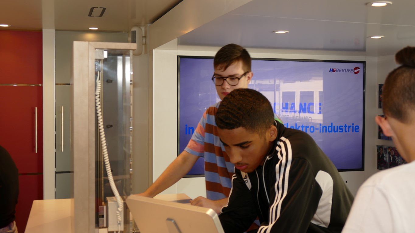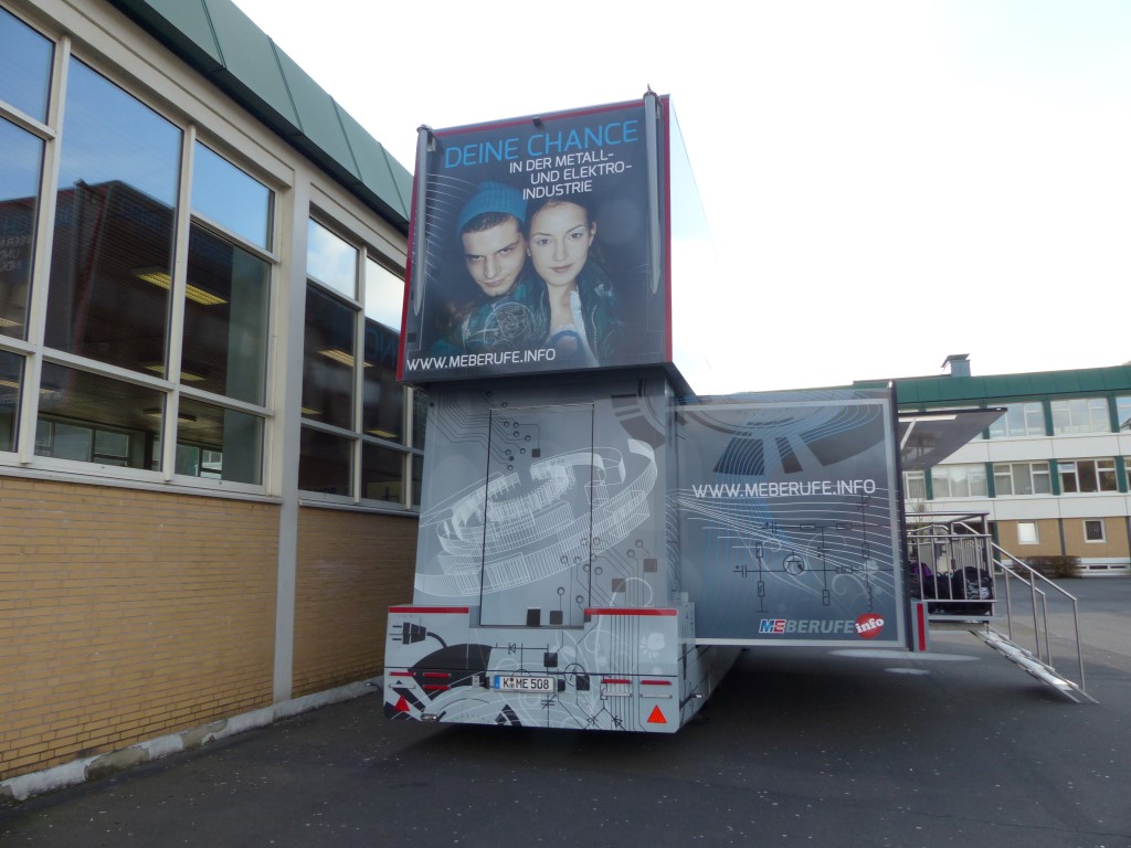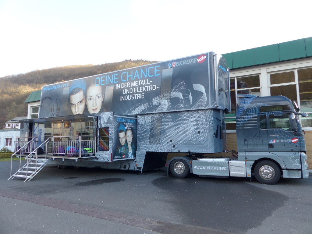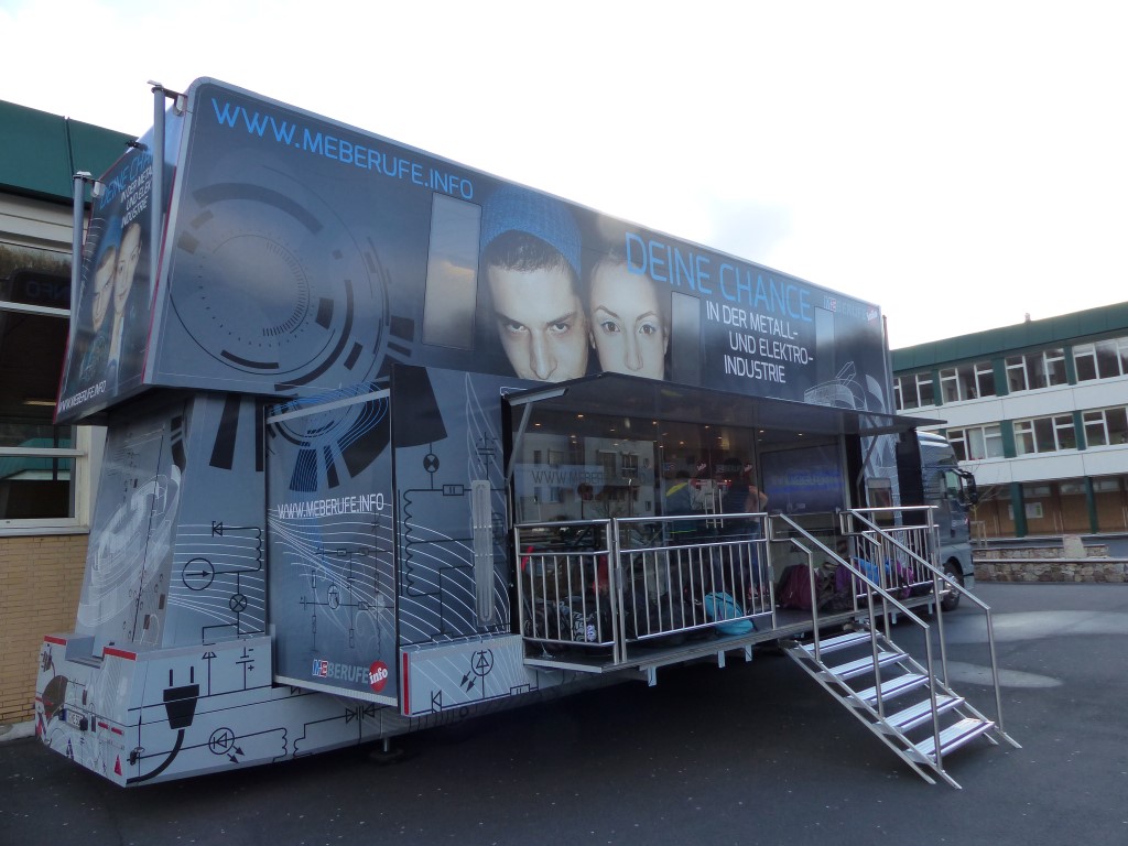 In Kooperation mit der Berufsberatung bot auch dies eine weitere Möglichkeit, freie Ausbildungsplätze in der Region, speziell im Kreis Birkenfeld, zu finden. Professionell begleitet wurden die Jugendlichen durch die Mitarbeiter der EWI-Medien GmbH und durch den Arbeitgeberverband Gesamtmetall. Auch im persönlichen Dialog konnten unsere Schülerinnen und Schüler besondere Themen mit den Mitarbeitern vertiefen. Begeistert waren die Jugendlichen vor allem von der hochwertigen Technik dieses mobilen Berufsinformationszentrums und von der „coolen“ IT-Technik.