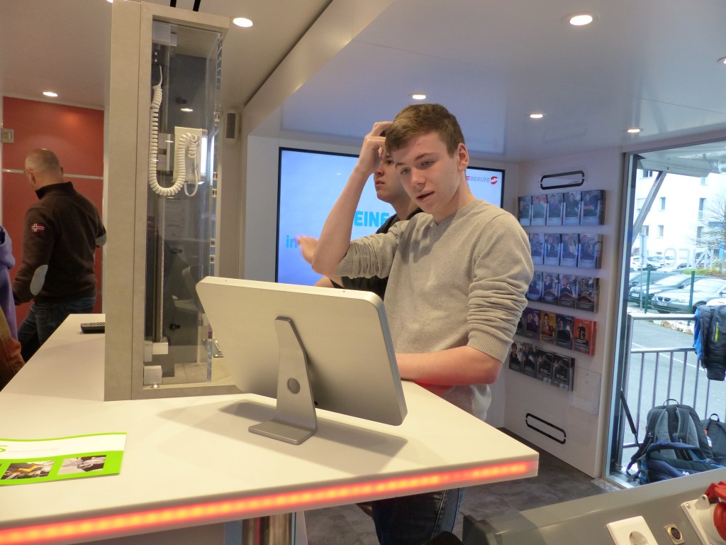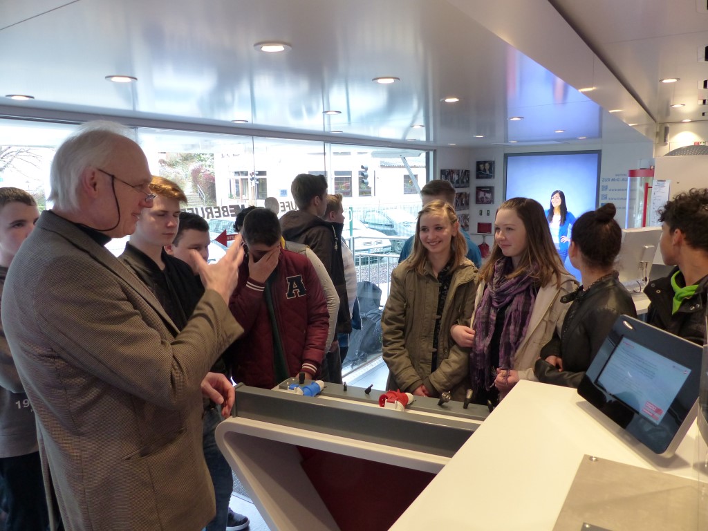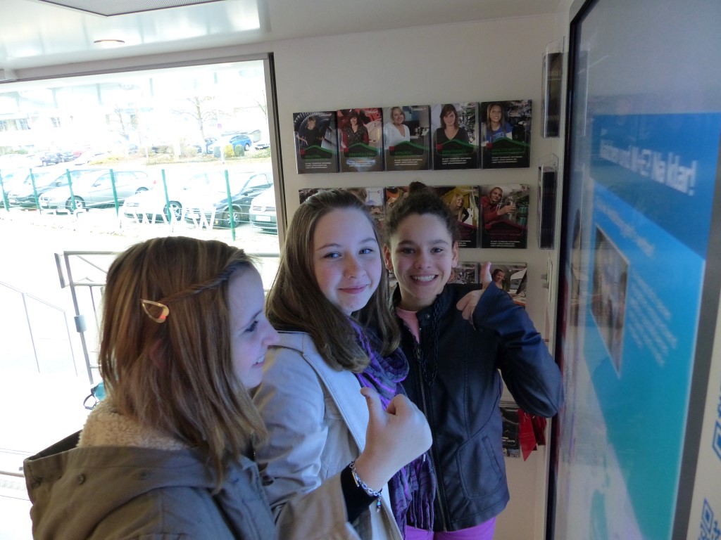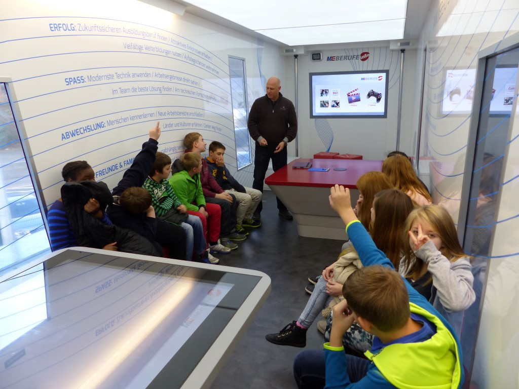 In Kooperation mit der Berufsberatung bot auch dies eine weitere Möglichkeit, freie Ausbildungsplätze in der Region, speziell im Kreis Birkenfeld, zu finden. Professionell begleitet wurden die Jugendlichen durch die Mitarbeiter der EWI-Medien GmbH und durch den Arbeitgeberverband Gesamtmetall. Auch im persönlichen Dialog konnten unsere Schülerinnen und Schüler besondere Themen mit den Mitarbeitern vertiefen. Begeistert waren die Jugendlichen vor allem von der hochwertigen Technik dieses mobilen Berufsinformationszentrums und von der „coolen“ IT-Technik.