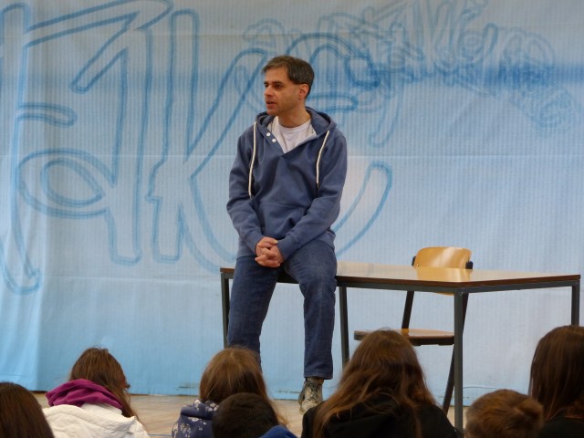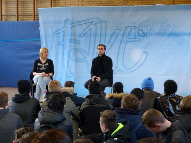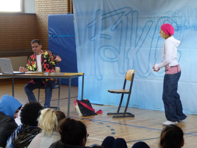 Fragen zur dargestellten Geschichte oder zu Produktion bzw. Hintergrundinformationen des Tourneetheaters „Ensemble Radiks“ wurden im anschließenden Gespräch zwischen Schülern und Schauspielern besprochen.