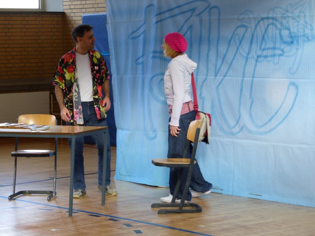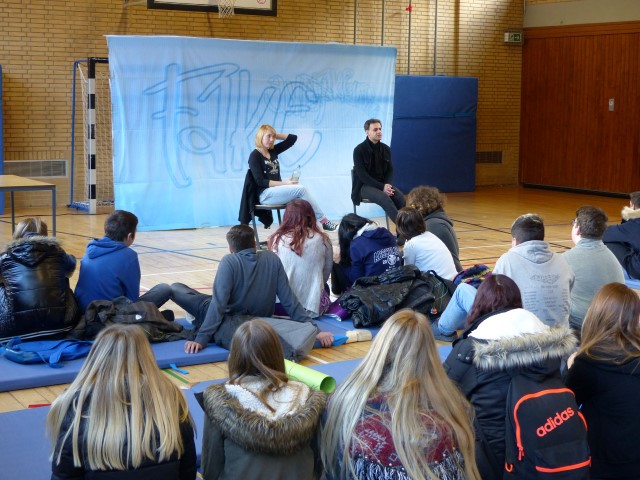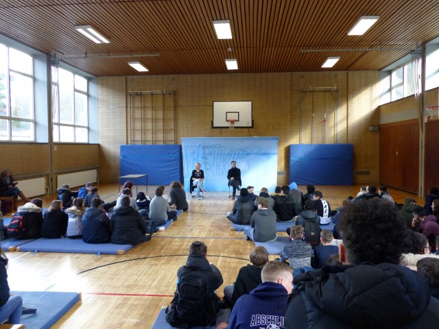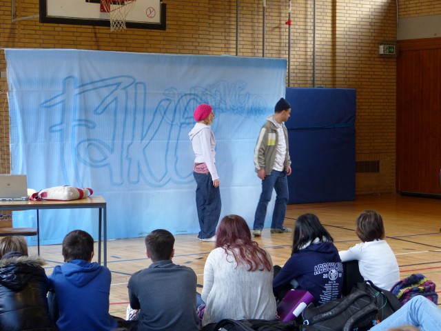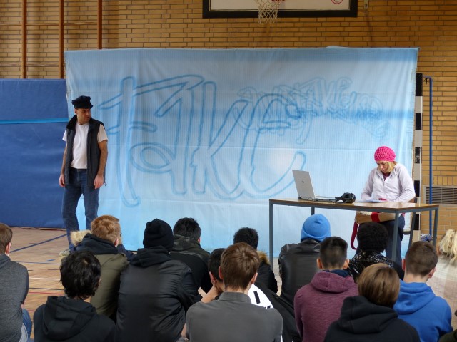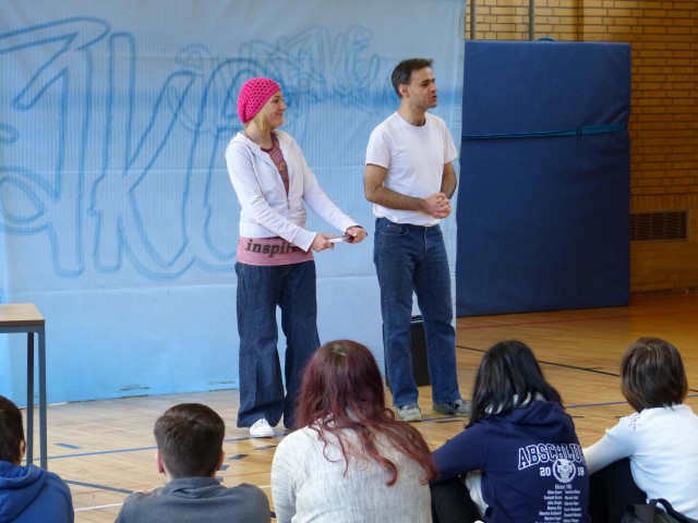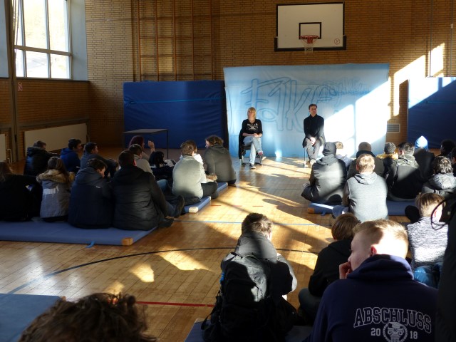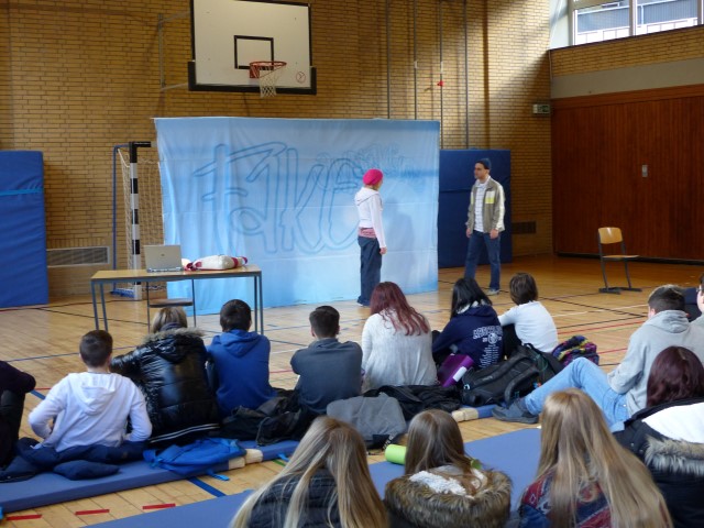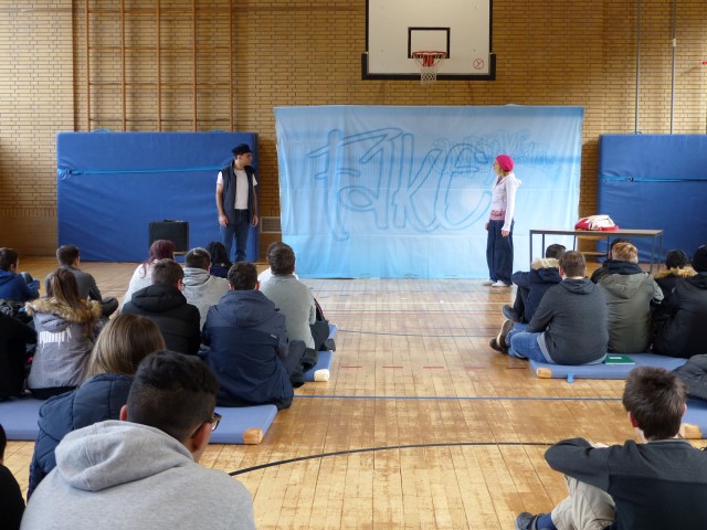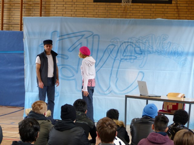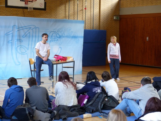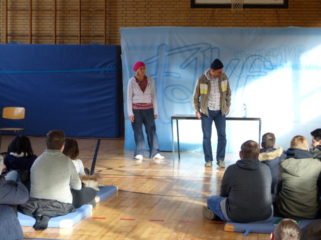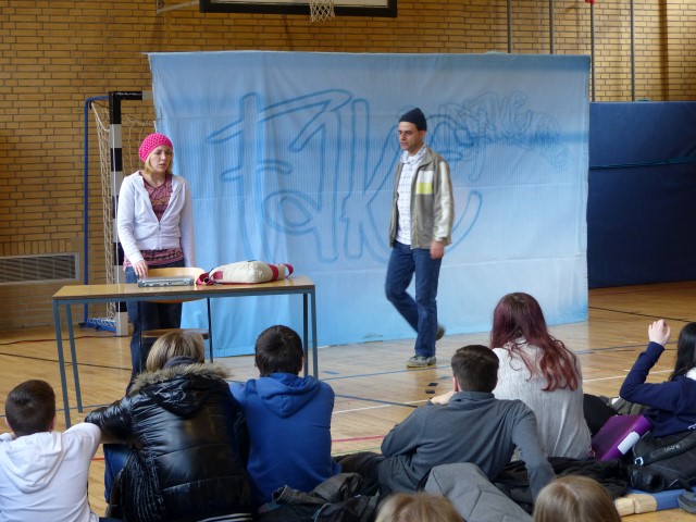 Wie aus vermeintlichem Spaß sehr schnell Ernst werden kann, zeigten am Donnerstag, den 18.01.2018 die beiden Schauspieler Romana Schneider und Alexander Abramyan des „Ensemble Radiks“ aus Berlin bei ihrer fesselnden Vorstellung in der Turnhalle der Ida-Purper-Schule.