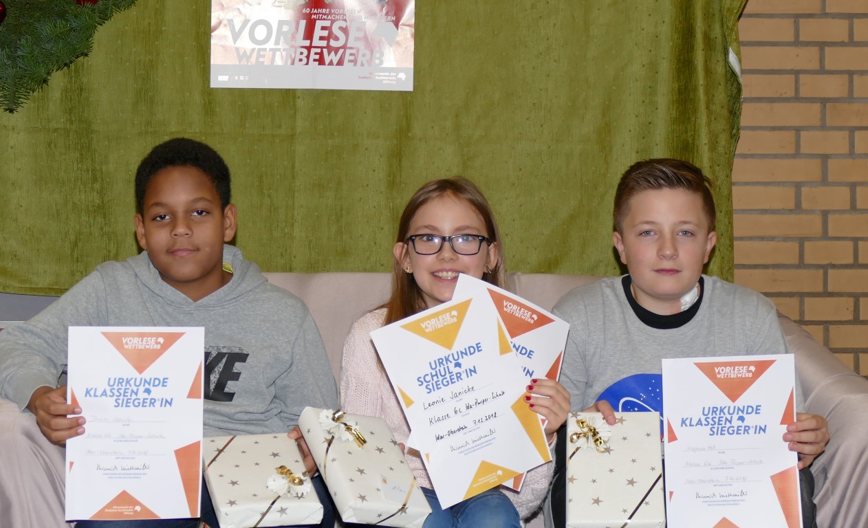 Sie lauschten aufmerksam den Vorträgen der Vorleser, die zuvor den Klassensieg errungen hatten. Magnus Heß vertrat die Klasse 6a und las aus Stefan Gemmels „Der Schattengreifer – die Zeitensegler“ vor. Mit dem Buch „Kid Normal – so sehen Helden aus“ von Greg Jones und Chris Smith ging Dimitri Steinle aus der 6b ins Rennen. Die Klasse 6c entsandte Leonie Janicke und drückte ihr mit „Das dicke Gruselbuch“ von Andreas Schlüter die Daumen.