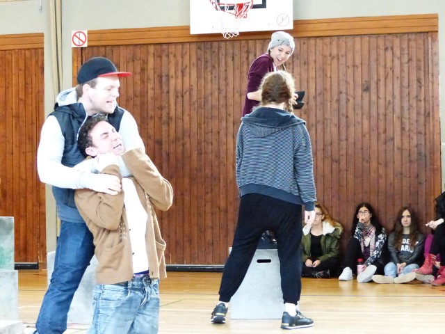 Die Gruppe britischer Schauspieler führte für die Klassen 5, 6 und 7 das Stück The Slug in the Shoe auf. In leicht verständlicher englischer Sprache wurde ein Thema präsentiert, das Kinder und Jugendliche anspricht und bewegt. Es geht um alleinerziehende Eltern, die sich ineinander verlieben, deren Kinder, Megan und Luke, jedoch versuchen, genau das zu verhindern. „The Slug in the Shoe ist eine Komödie darüber, wie sich Mädchen und Jungen gegenseitig wahrnehmen. Das Stück vereint Humor mit einer einfühlsamen Annäherung an die Probleme von alleinerziehenden Eltern und des Erwachsenwerdens” (White Horse Theatre).